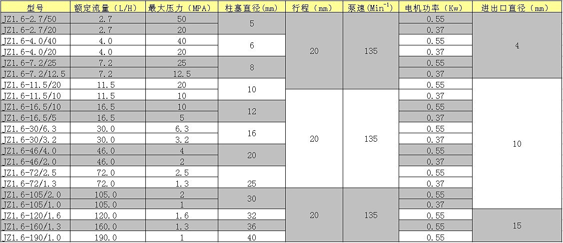 JZ1.6系(xi)列柱塞計量泵(bèng),流量數據表